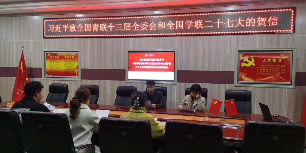 会上,研究生工作秘书陈楠老师带领大家共同研读了《习近平致全国青联十三届全委会和全国学联二十七大的贺信》和《唱响新时代爱国团结跟党走的青春之歌——在中华全国青年联合会第十三届委员会全体会议和中华全国学生联合会第二十七次代表大会上的致词》这两个文件。陈老师强调,广大青年学生要把学习贺信和致词精神与学习近平总书记对青年学生一以贯之的要求结合起来,深刻领悟总书记对青年学生的殷殷关怀与谆谆教导,深切感悟领袖的历史担当、人民情怀,不断增强政治认同、思想认同、情感认同,坚持德智体美劳全面发展,努力成长为担当民族复兴大任的时代新人。
