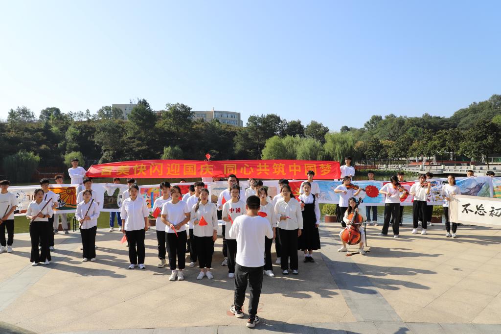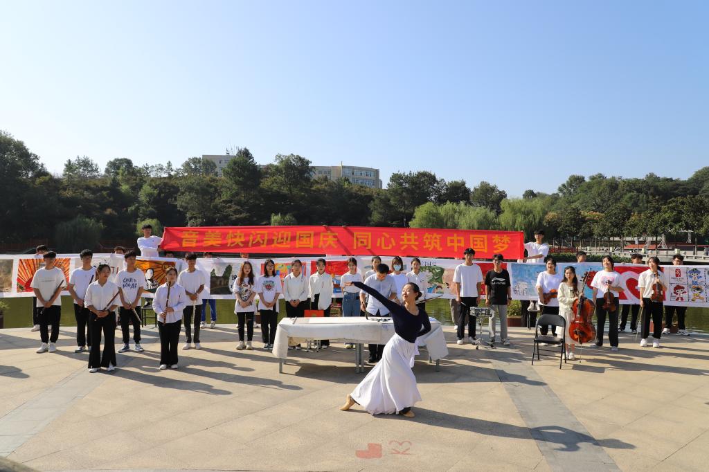 欣望江山千里秀,欢颂祖国万年春。在今天这个举国欢庆的美好日子里,由304am永利集团和美术与设计学院联合举办迎国庆快闪活动,在图书馆前的半亩塘顺利举行,校团委领导副书记常青,304am永利集团、美术与设计学院党委副书记,师生代表以及在场300余名同学观看了此次活动。